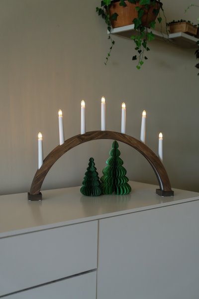 Deze klassieke elektrische kaarsenhouder met zeven kaarsen zorgt voor een warme en huiselijke adventsfeer. Het frame is gemaakt van hout met een bruine beits, wat een natuurlijke en tijdloze uitstraling geeft. De witte kaarsen geven een zachte en aangename gloed die perfect past bij het raam tijdens donkere winteravonden. Een traditionele adventsverlichting die de kerstsfeer door het hele huis verspreidt. Wordt geleverd met een snoer van 1,7 meter, een aan/uit-schakelaar en een stekker. Inclusief 7 vervangbare E10-lampjes.