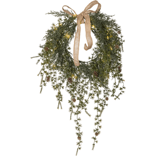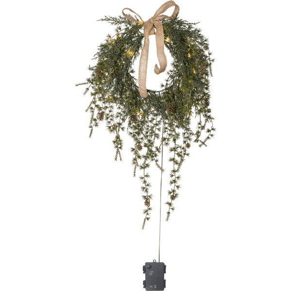 De krans van dennenappels heeft lange, kronkelende takken en is gemaakt van PE-materiaal, wat een goede keuze is voor het milieu. Dankzij de 20 warmwitte lichtpunten is hij zowel geschikt als deurkrans buitenshuis als wandkrans binnenshuis. Als extra versiering is deze krans voorzien van een strik van jute. De slinger werkt op 3 AA-batterijen en heeft ook een timerfunctie (6 uur aan, 18 uur uit, herhalend). Als de schakelaar aan staat, brandt de slinger ongeveer 30 dagen in de timermodus. Batterijen niet inbegrepen. Wordt geleverd met 50cm snoer voor aansluiting op de batterijbox.