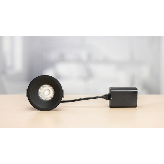 DWN-02 heeft een instelbare kleurtemperatuur en kan worden ingesteld op een vaste temperatuur of dimmen naar warm. Zwart.