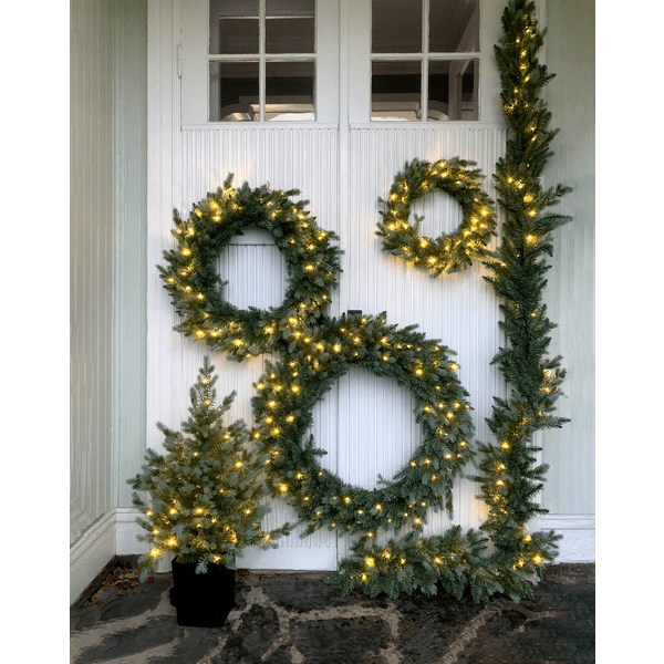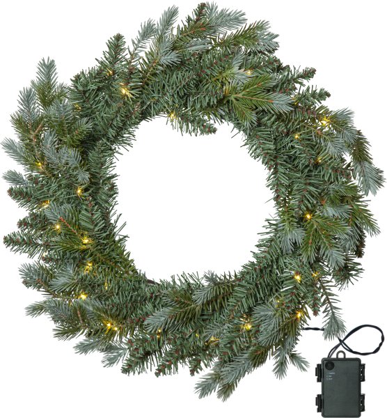 De Greyland-krans is ca. 55 cm in diameter. Het is gemaakt van een mix van PE- en PVC-punten met een prachtige, groen-groene, glinsterende uitstraling. Met 40 kleine, warmwitte lichtpunten zorgt hij zowel binnen als buiten voor een prachtig licht. De lus kan constant branden of worden ingesteld met een timer die ervoor zorgt dat de lus 6 uur brandt en 18 uur uit is, om de volgende dag weer te branden. Het apparaat werkt op 3 AA-batterijen, deze zijn niet inbegrepen. Tot dezelfde familie behoren ook sparrenbomen, kransen in verschillende maten en een guirlande.