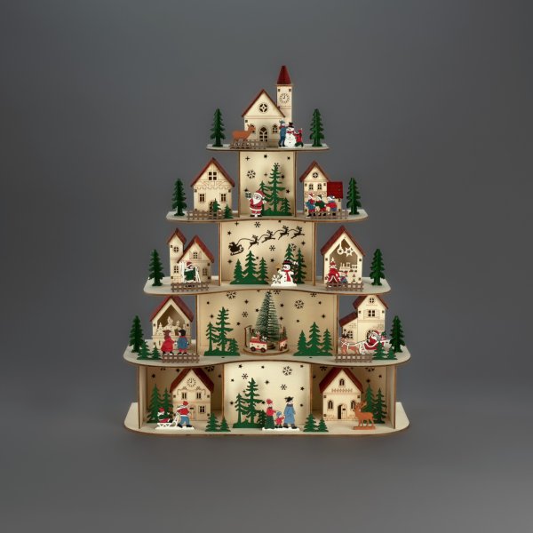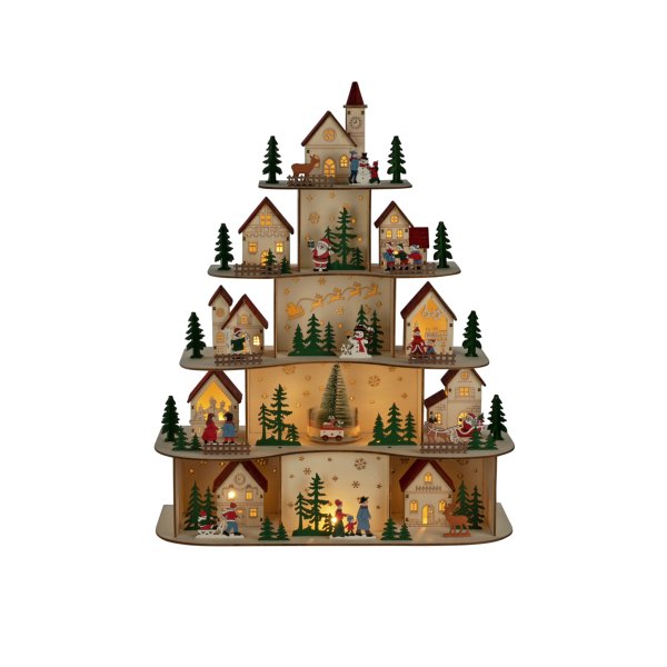 Creëer een warme en sfeervolle kerstsfeer met dit decoratieve houten kerstdorp. Het gedetailleerde ontwerp, verdeeld over meerdere verdiepingen, toont kleine huisjes, dennenbomen en wintermotieven die samen een charmant kerstverhaal vormen. De geïntegreerde ledverlichting verlicht de scènes en zorgt voor een zachte, uitnodigende gloed. Een perfecte decoratie voor tafels, vensterbanken of dressoirs tijdens de advent- en kerstperiode. Het kerstdorp werkt op 3 AA-batterijen (niet meegeleverd) en is voorzien van een timerfunctie (6 uur aan en 18 uur uit, herhalend), waardoor het zowel praktisch als energiezuinig is. Er wordt ook een USB-kabel meegeleverd voor wie een snoer wil gebruiken (transformator niet meegeleverd).