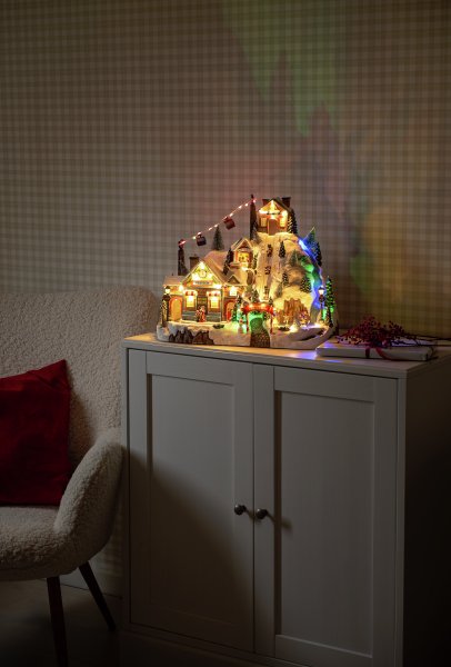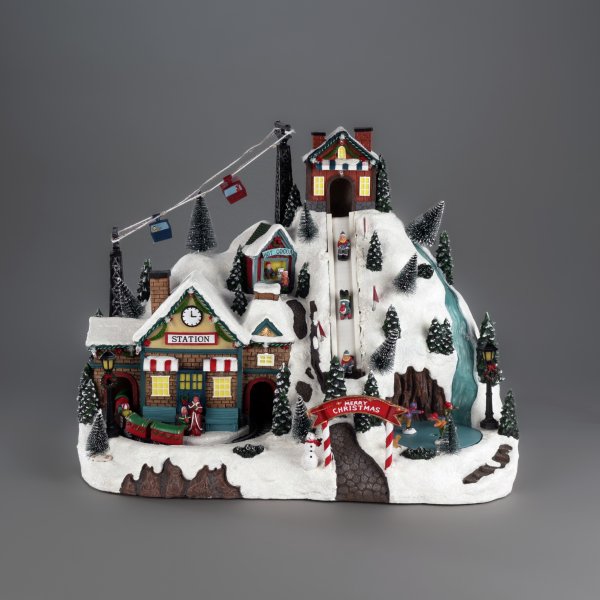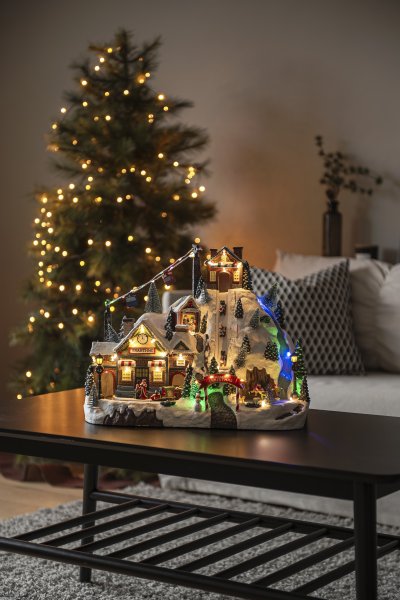 Creëer een levendige en magische kerstsfeer met dit gedetailleerde kerstdorp in de vorm van een skigebied, gemaakt van polyhars. De met sneeuw bedekte omgeving met station, skipiste en lift verspreidt een geweldige winterse sfeer. In totaal verlichten 42 led-diodes het dorp in verschillende kleuren en creëren een sfeervolle gloed, terwijl er muziek wordt afgespeeld voor een extra feestelijke ervaring. Het kerstdorp werkt op 3 AA-batterijen (niet meegeleverd) en wordt geleverd met een USB-kabel voor gebruik met een snoer (transformator niet meegeleverd).