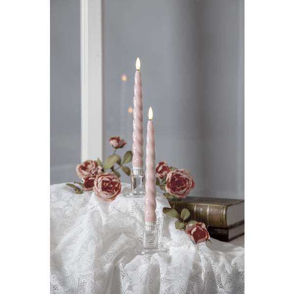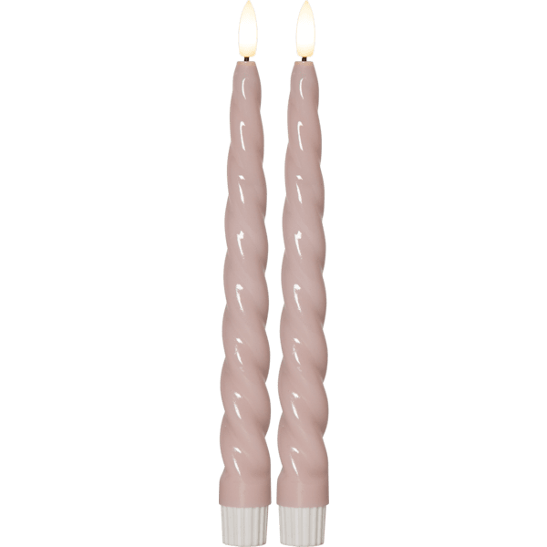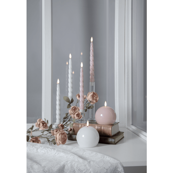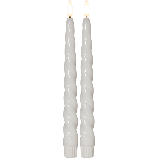 Flamme Shine is een antieke kaars in een 2-pack met een levensechte vlam. De lamp heeft een glanzend oppervlak en een lichte draaiing, wat hem een luxueuze uitstraling geeft. Deze LED-lamp is een prachtige decoratie, zowel alleen als in een groepje met andere lampen uit de Flamme-serie. Het heeft een timerfunctie. Wanneer de schakelaar aan staat, brandt het licht in de timermodus 6 uur aan en 18 uur uit, herhalend, met een prachtige realistische vlam in warm wit licht. Ze werken op 4 AAA-batterijen, deze zijn niet inbegrepen. Deze kaarsen hebben een siliconen gecoate onderkant, waardoor de kaarsen steviger in de kaarsenhouder staan. Brandduur ca. 200 uur.