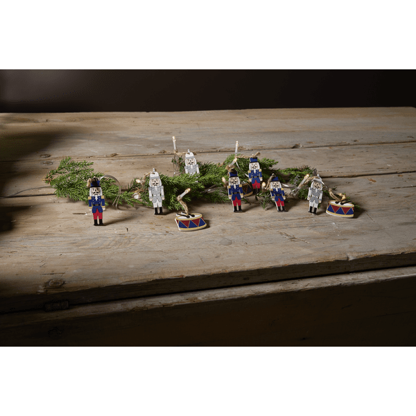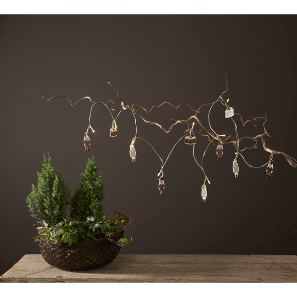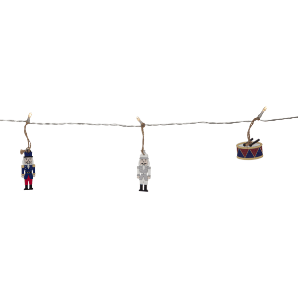 Lichtsnoer voor binnen, versierd met 10 houten figuurtjes in de kleuren blauw/grijs/wit en rood. De figuurtjes zijn aan elkaar geknoopt met henneptouw. Decoratieve decoratie die een gezellige gloed in huis geeft. Voorzien van een timer: 6 uur aan, 18 uur uit, herhalend. Werkt op 2 AA-batterijen (niet meegeleverd). Inclusief 30 cm extra snoer van het batterijvakje naar het eerste figuurtje.