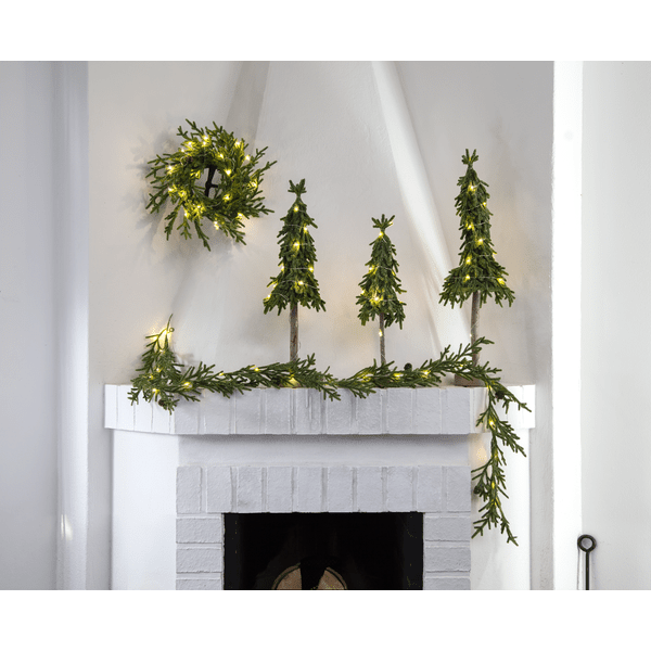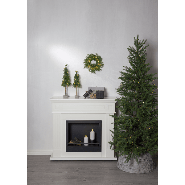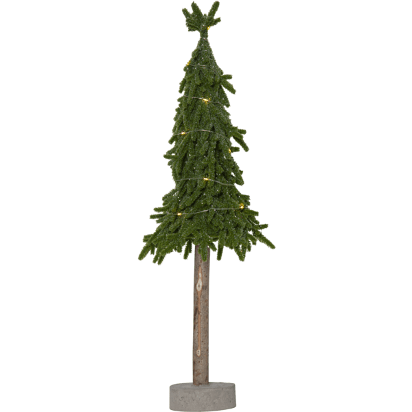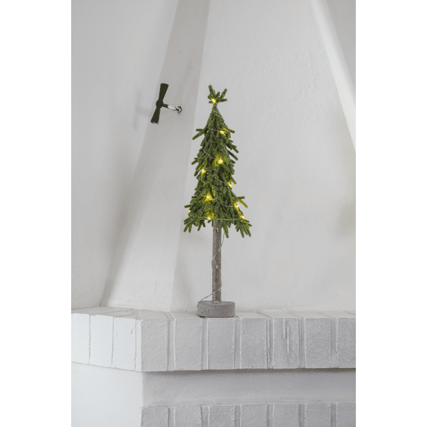 Decoratieve, kleinere tafelkerstboom van PE-materiaal met een beetje glitter en een stabiele cementen voet. De boom licht op met 15 kleine warmwitte LED-diodes. Plaats hem op een bijzettafel, onder de boom of op de eettafel als decoratie bij het dekken van de tafel. Wordt geleverd met een snoer van 30 cm naar het batterijcompartiment. De boom werkt op 2 AA-batterijen (niet inbegrepen). Brandduur: ca. 200 uur.
