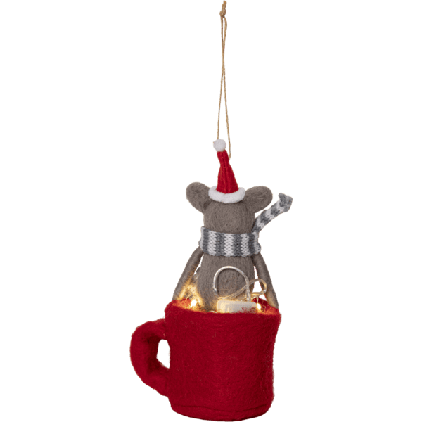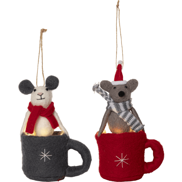 Twee schattige wintermuisjes van vilt. Een klein LED-lichtsnoertje geeft een mooi warm wit licht in het kopje. Versier de kerstboom of de kamer thuis en creëer een kerstsfeer. Voorzien van een timer: 8 uur aan, 16 uur uit, herhalend. Werkt op 4 CR2032-batterijen (niet meegeleverd).