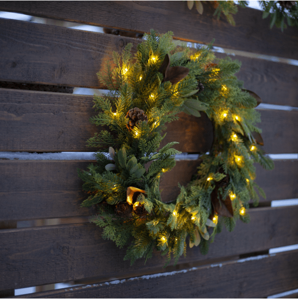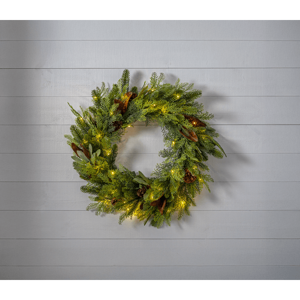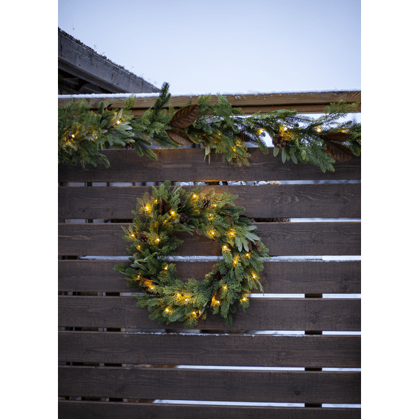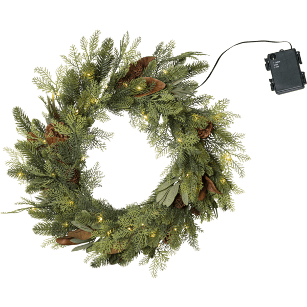 De Mixi-krans is gemaakt van een mix van bladeren en naalden, vervaardigd van PE-materiaal. Met 30 warmwitte LED-diodes in de vorm van dauwdruppels geeft hij een mooie, warme witte gloed. De krans is geschikt voor zowel binnen als buiten en staat prachtig als decoratie aan een deur of muur. Hij is voorzien van een timer: 6 uur aan, 18 uur uit, met een herhalend schema. Wordt geleverd met een kabel van 30 cm naar het batterijcompartiment. De krans werkt op 3 AA-batterijen (niet meegeleverd). Brandduur: ca. 150 uur.
