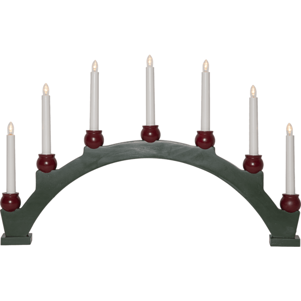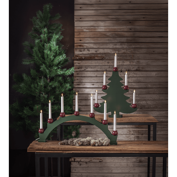 Groene adventskaarsenhouder met een mooie boogvorm. Vijf LED-kaarsen met rode houders zorgen voor een gezellige gloed en een traditioneel lichteffect. Laat de warmte van Kerstmis zich door het raam verspreiden met deze klassieke kaarsenhouder. Plaats hem in het raam of op het dressoir. Wordt geleverd met een wit snoer van 1,8 m, een aan/uit-schakelaar en een stekker. Inclusief 7 vervangbare E10 LED-lampjes.