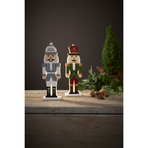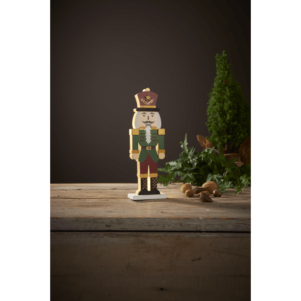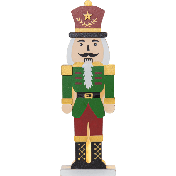 Stijlvolle notenkraker van lasergesneden hout, de voorkant is beschilderd in de kleuren rood, groen, goud en zwart. Kleine ledlampjes schijnen tussen de twee uit een puzzel gesneden silhouetten, een voor- en een achterkant. Versier je bureau of plank met de notenkraker voor Kerstmis en de adventstijd. Voorzien van een timer: 6 uur aan, 18 uur uit, herhalend. Werkt op 2 AAA-batterijen (niet meegeleverd).
