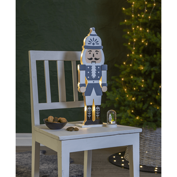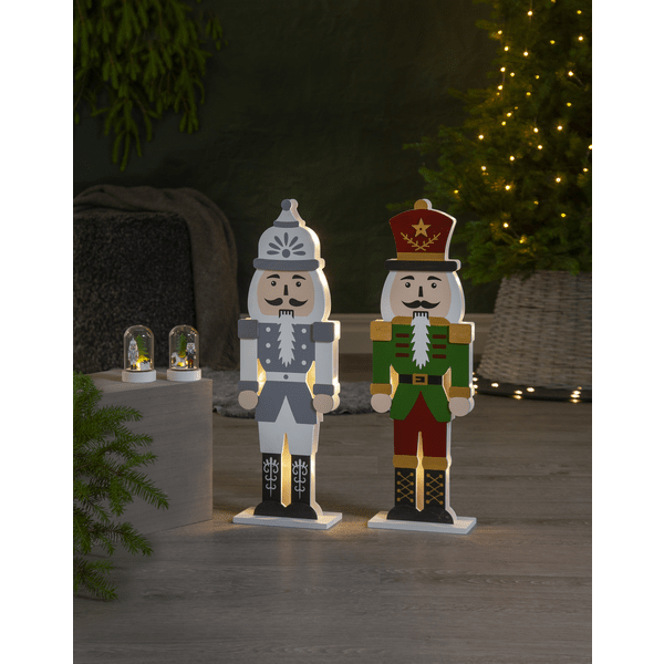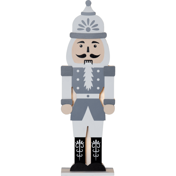 Stijlvolle notenkraker van lasergesneden hout, de voorkant is gemarkeerd in de kleuren grijs, wit en zwart. Kleine ledlampjes schijnen tussen de twee uit de puzzel gesneden silhouetten, een voor- en een achterkant. Versier je bureau of plank met de notenkraker voor kerst en advent. Voorzien van een timer, 6 uur aan, 18 uur uit, herhalend. Werkt op 2 AA-batterijen, niet inbegrepen.