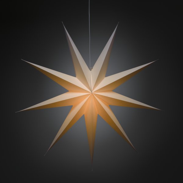 Verlicht de duisternis van december met deze klassieke witte papieren ster. Met zijn stijlvolle design en zachte licht verspreidt het een rustige en huiselijke kerstsfeer. Ideaal om in het raam te hangen of tegen een mooie muur – een tijdloze decoratie die elke kamer met haar eenvoudige elegantie verfraait. Wordt geleverd met 5 m wit snoer, aan/uit-schakelaar en stekker. Lichtbron niet inbegrepen.