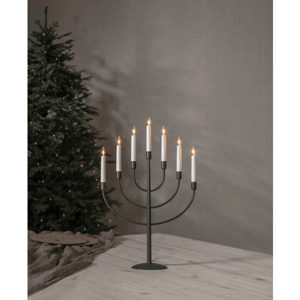 Onze elegante metalen kandelaar Titus in het groen met de nieuwste lichtbron. Perfecte Adventkandelaar voor Kerstmis, verspreidt een prachtig licht en creëert een kerstsfeer. Wordt geleverd met 1,8 m wit snoer, aan/uit-schakelaar en stekker. Inclusief 7 vervangbare E10 LED-lampen (24V).